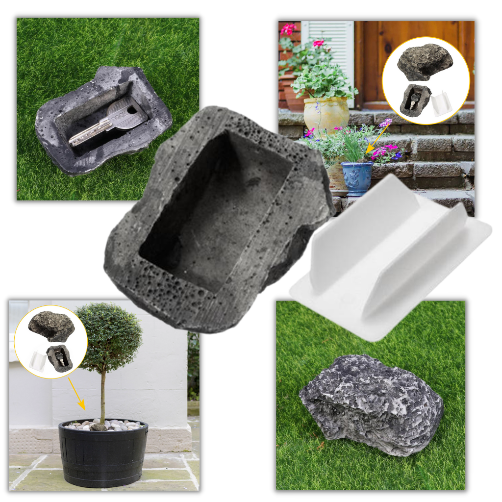 The idea is simple. Keep your keys, or a spare, in the rock. It’s a small, realistic-looking rock. The rock is hollow inside and has a small plastic cover that fits into the bottom. You can hide several keys there. Just take the cover off and put the keys inside! Then slide the cover back into place. With handy access to your spare keys, never get locked out again!